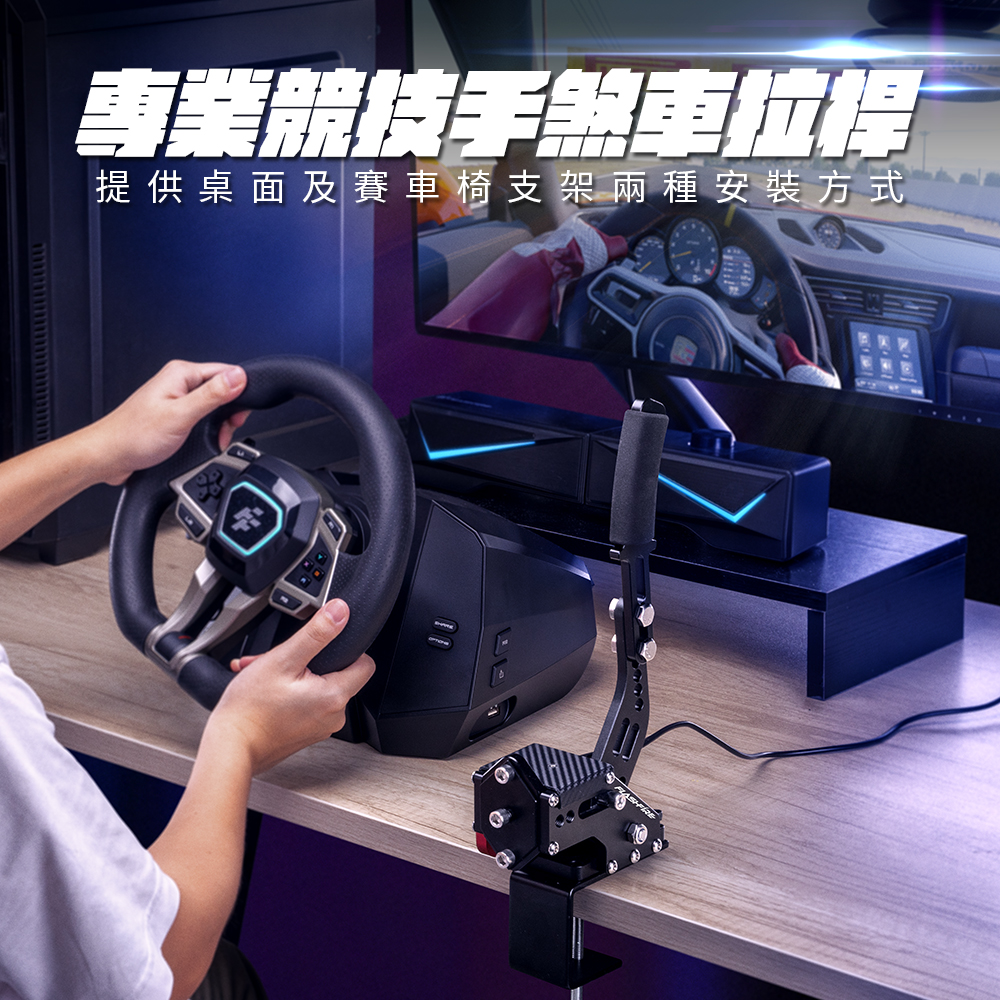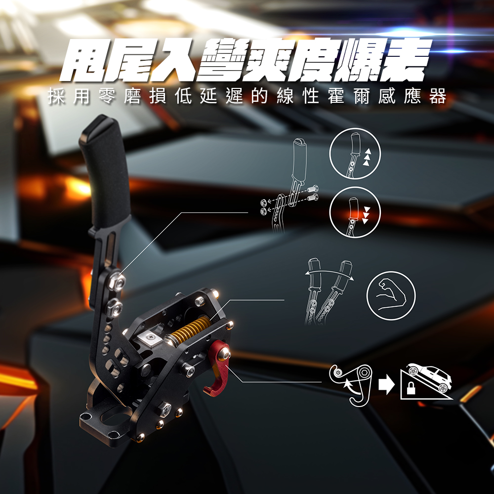 霍爾式磁感應線性手煞車桿,會根據使用力度反應手煞力道,適合飄移甩尾使用。金屬材質更牢固耐用,附帶扣環可將手煞車固定,適合用在卡車模擬遊戲。